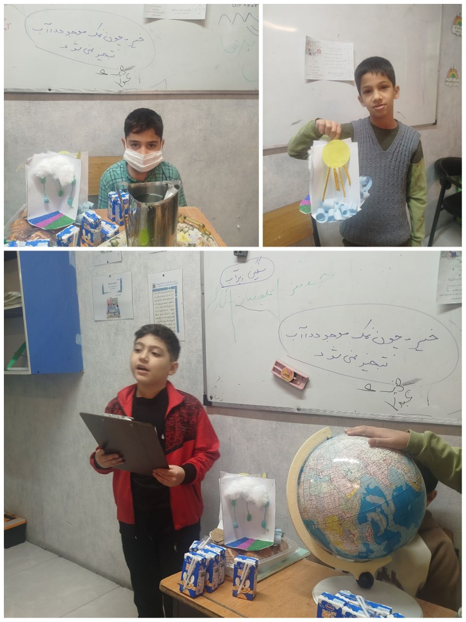 چهها با برنامه ریزی و تقسیم کار ابتدا با کاردستی که در مورد چرخه آب درست کرده بودند چرخه آب را به خوبی توضیح دادند و سپس کاربرگ چرخه آب رابه همهی دانش آموزان دادند و بعد از آن آزمایش های مربوط به این که آیا آب باران شور است؟ را انجام دادند وسپس در مورد صرفه جویی در آب و کمبود آب شیرین را با فعالیت کارورزی به خوبی توضیح دادند.